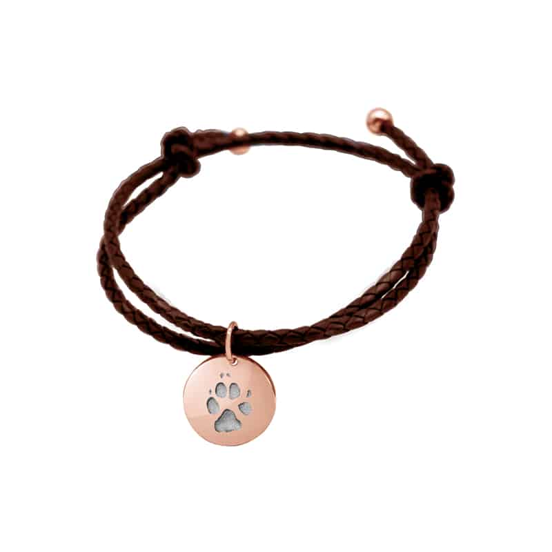 Dieser einzigartige Pfotenabdruck ihres Lieblings in der Farbe Rosé mit braunen Armband